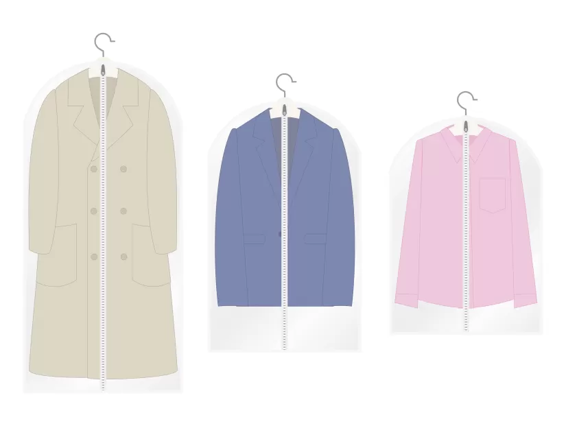 立体用ガーメントは、その名の通り両サイドにマチがある立体的な形状が特徴です。さまざまな形やサイズの衣類を包み込める万能さがあります。 特にスーツやドレスなど、形の崩れやすいアイテムに最適です。